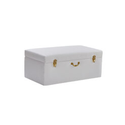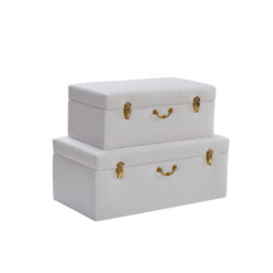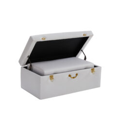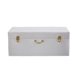Add convenient storage to your living space and with this beautiful white matching storage trunk set. The elegant design features durable faux leather fabric and is adorned with golden locks and a matching handle. This opulent piece is built to last and is made with a durable hardwood frame and strong hinges. Additional lift supports have been added so that lid will stay open if need be and won’t slam shut.